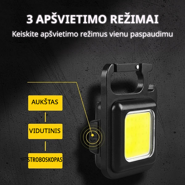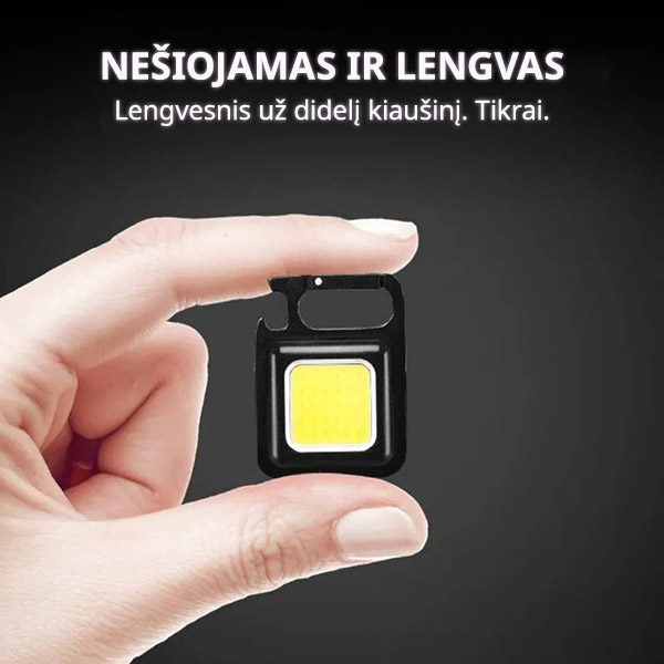 Ši mini kišeninė LED lemputė suteikia iki 50 kartų stipresnę šviesą nei telefono blykstė ir veikia iki 5 valandų vienu įkrovimu!