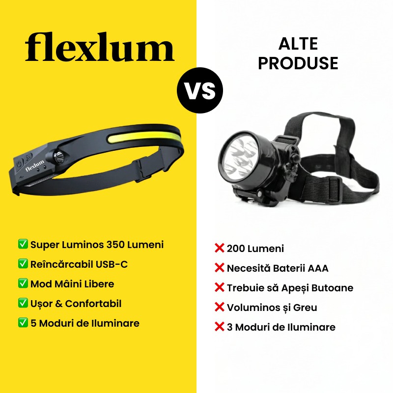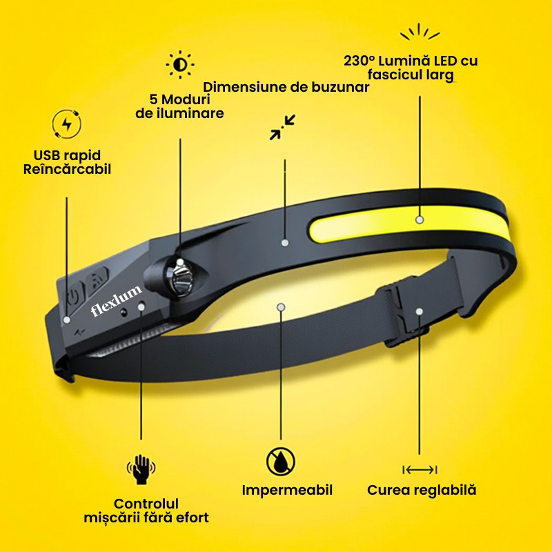 Te-ai săturat să te orientezi pe întuneric? Spune adio colțurilor întunecate și umbrelor cu Lanterna Frontală LED Flexlum 230°!